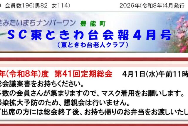 新着履歴情報 ☆新着履歴の表示をしています。 新着履歴情報 回覧板・お知らせ 自治会 4月回覧 ゴールデンウイーク休館のお知らせ 自治会 3月第4週・回覧 東ときわ台だより 3月号 2026年度【再生資源回収日程表】 自治会活動・行事 公園・緑道等の一斉清掃(クリーン作戦)のお知らせ いきいき百歳体操 4月日程 いきいき百歳体操 3月日程 いきいき百歳体操 2月日程 いきいき百歳体操 1月日程 みんなの広場(新着情報) 「第十回 高山右近・志野花嫁行列」のお知らせ 東ときわ台小学校 閉校イベント 第59回笑雲cafe「やってみたい」が まち を動かす ニセ警察詐欺が急増 ー やってみよう!ニセ警察詐欺の仮想体験 クリスマスイルミネーションを点灯🎄 とんど焼き🎍 のお知らせ 高齢者とお薬について いきいき百歳体操 12月日程 いきいき百歳体操 11月日程 福祉の広場(新着情報) 3月 ふれあいサロン「あの歌この歌♪歌いましょう」を開催 ふれあいサロン 4月お知らせ 2月 ふれあいサロン「消費者問題ミニ講座」を開催 ふれあいサロン 3月お知らせ 1月 「新年ふれあい会食」を開催 SCの広場(新着情報) 4月15日(水)4丁目公園の清掃を行いました 映画観賞会「だまし絵の牙」5月12日(火)豊寿荘で開催 SC東ときわ台「4月号」会報掲載 映画観賞会「春の雪」4月14日(火)豊寿荘で開催 SC東ときわ台会報「3月号」会報掲載