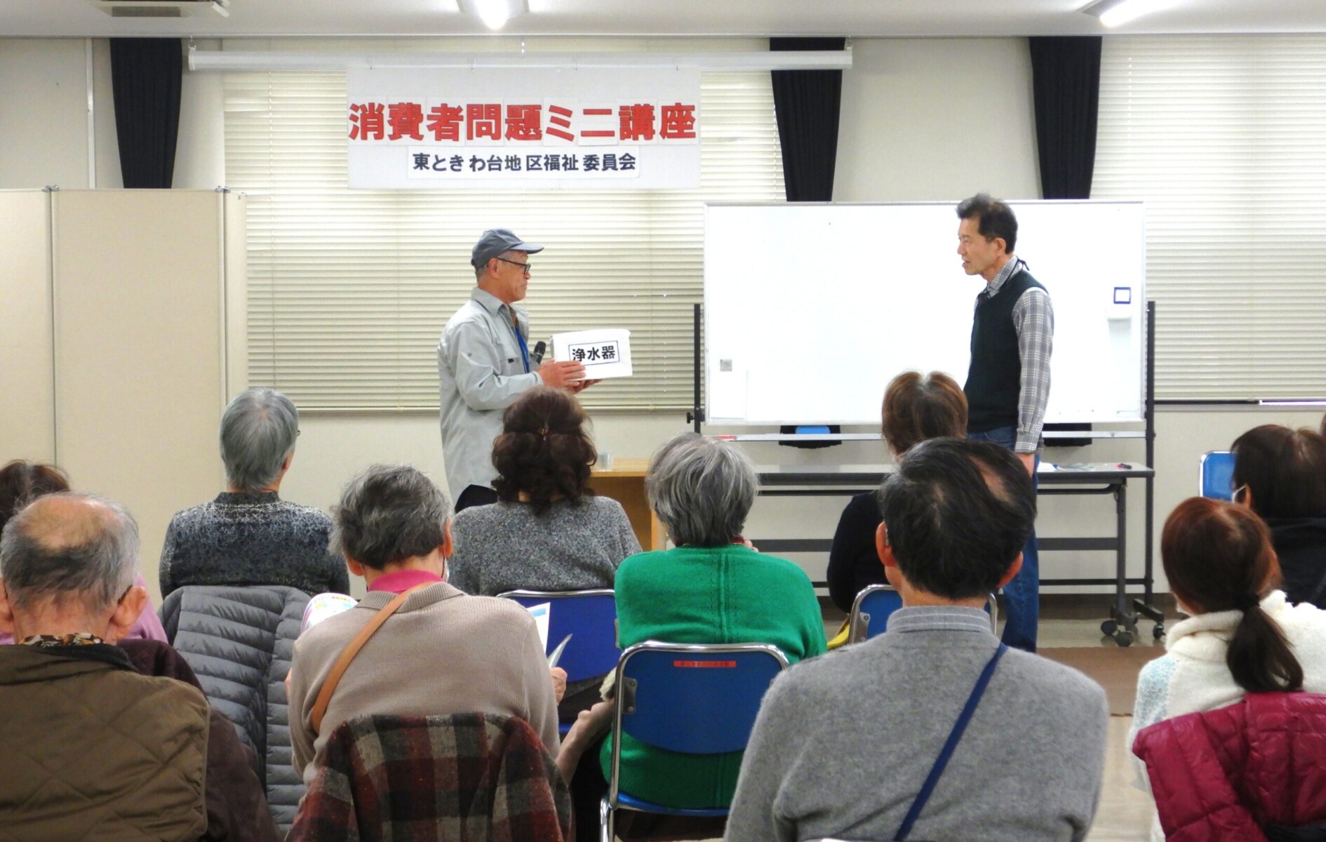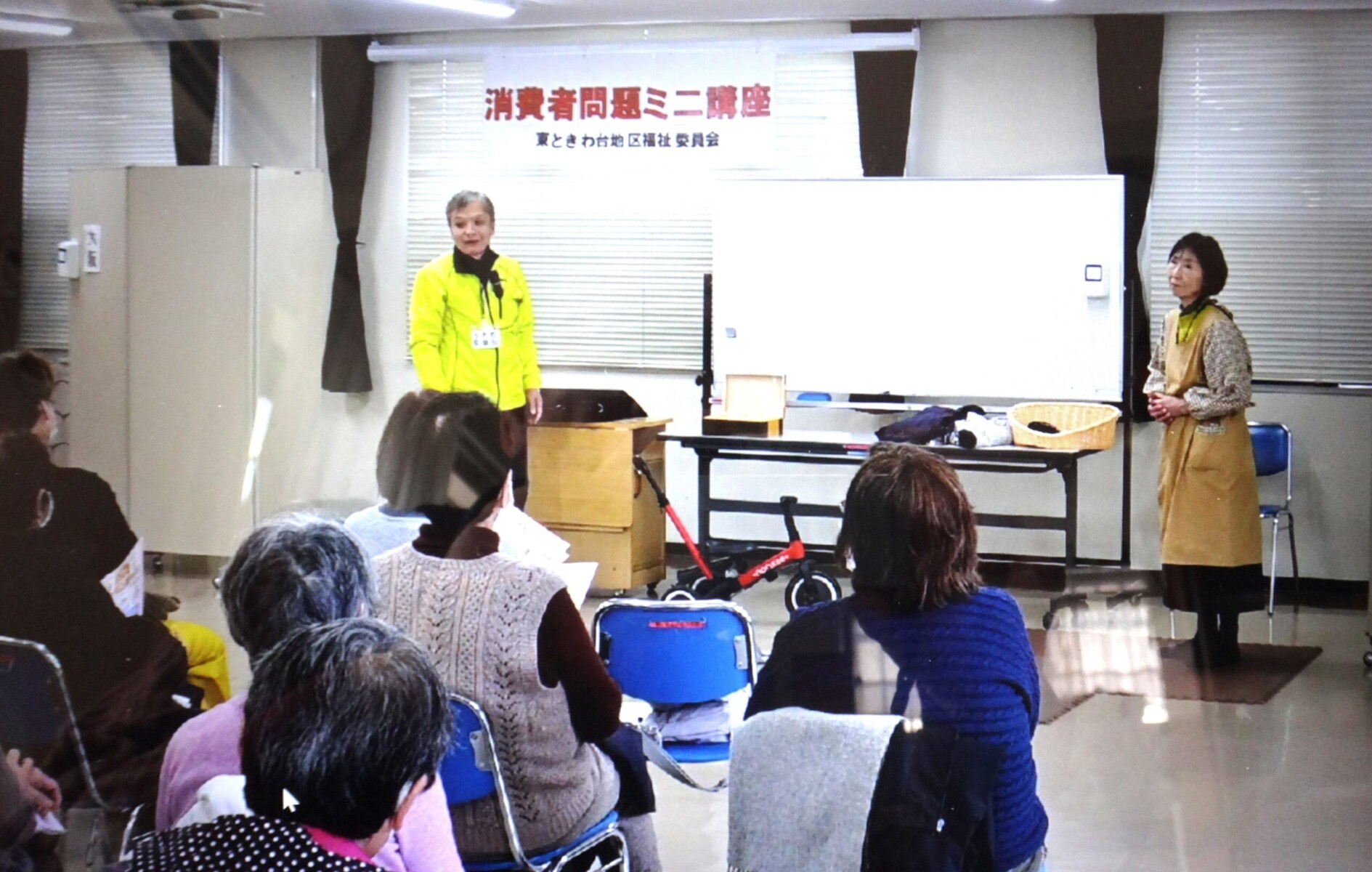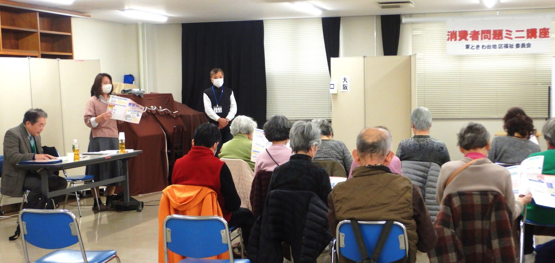 今月は豊能町内でも多発している消費者トラブルについて「消費者問題ミニ講座」を開催しました。福祉委員による寸劇2種を見ていただいた後に各種資料を元に消費のサポーター 石川さんの解説と豊能町消費生活相談員 中野さんの説明がありました。